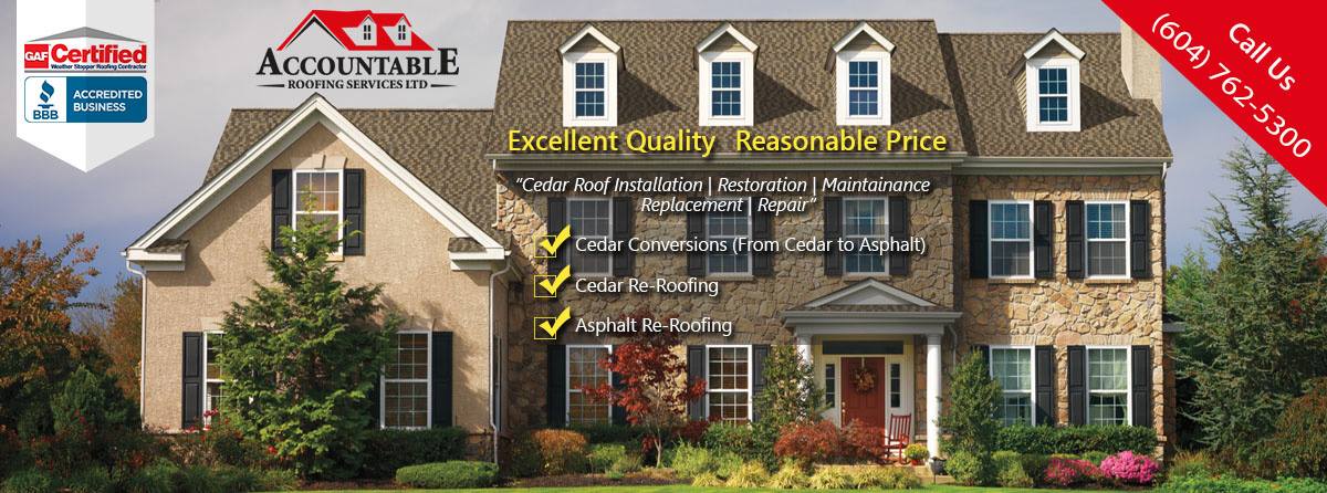 Accountable Roofing is a licensed, insured, fully accredited roofing company serving Surrey, Langley, Burnaby, Coquitlam, White Rock, Abbotsford and Maple Ridge. They provide residential and commercial roofing services including cedar, asphalt, flat roofing, skylights, soffit and fascia installations. The business offers a 20‑year workmanship guarantee with leak‑proof protection.